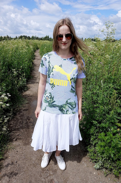Going further out of my comfort zone I decided to wear this Puma top that I usually wear with jeans on a weekend, but I just knew it would go and also help dress down the skirt. I'm not usually one to don active wear when I'm not being, well, active, but the print on this top is kind of too pretty to waste on just exercising and I quite like the contrast of the sports logo against the pretty print.